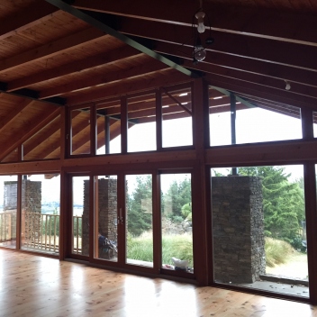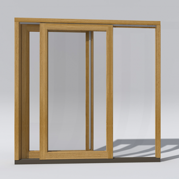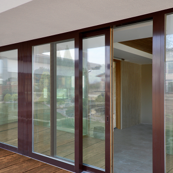 Glasfasaden byggs upp med en kombination av fasta och skjutbara glaspartier. Skjutdörrarna kan låsas från både in- och utsidan. Andra fördelar med denna dörrmodell är den sänkta aluminiumtröskeln, som endast är 20 mm över golvnivån. Skjutdörrarna kan fås med elektrisk styrning (öppna och stäng) och trådlös kontroll.